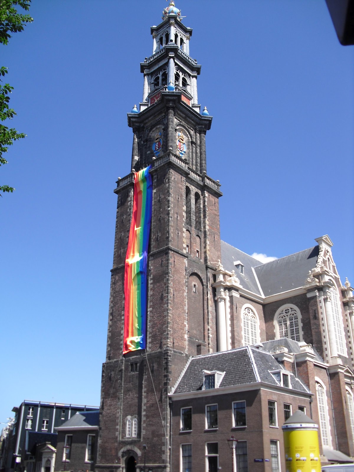 Najväčší  protestantský kosotol v Amsterdame každoročne vyvesuje dúhovú vlajku počas LGBTI pridu.